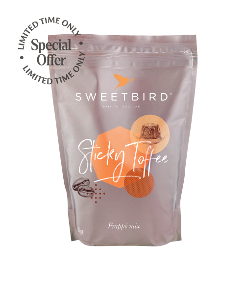 1. One 25g scoop Sweetbird Sticky Toffee Frappe mix in a mug